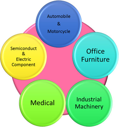 Our business field is spreaded in many industries, Vehicles, Vehicle parts, Furniture, Electronics, Semicondutors and so on.